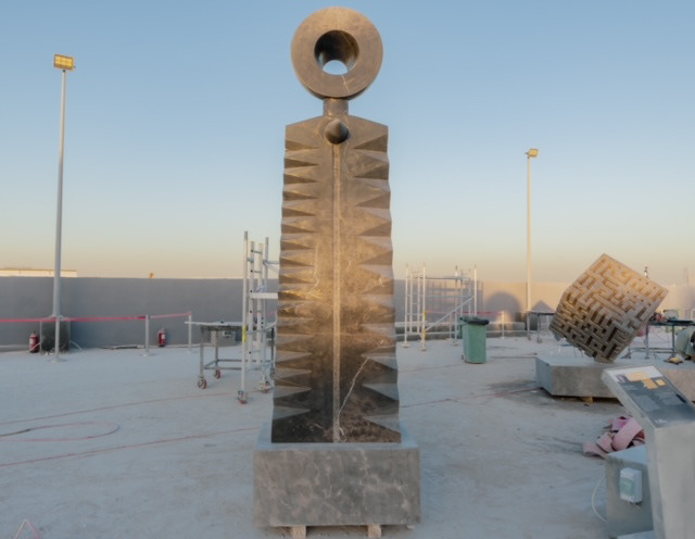 The focus is on time and structure. Research referenced ancient forms, construction methods and materials. The triangular formations found in mud and straw constructions in Riyadh which offer great structural stability, strength, and are also found in Egyptian shapes, African carving, & in philosophy meanings, suggesting perspective, growth, direction. In sculptural language the forms offered me an opportunity to explore depth, repeat imagery, strength & form.